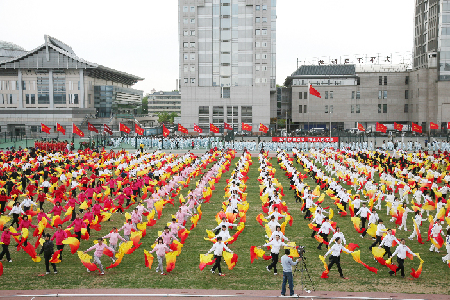PKU Council Chairman Min Weifang announced the start before faculty, staff members and students performed group calisthenics. Teachers first danced with silk fans. Students wearing light blue clothes did Taijiquan, a traditional Chinese soft style martial art. Students in Uyghur dress showed a folk dance with the rhythm of ethic music.