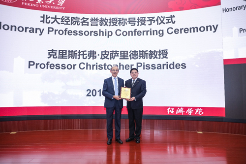 Towards the end of the event, Dean Dong Zhiyong conferred on Pissarides the certificate of Honorary Professorship of PKU School of Economics.