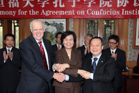 Peking University, Nov.4, 2011: The signing ceremony for the Confucius Institute at Stanford University run jointly by the Office of Chinese Language Council International (Hanban), Peking University (PKU) and Stanford University was held at Linhuxuan. Hanban Director-General Xu Lin, President John Hennessy of Stanford University and PKU President Zhou Qifeng, signed the Agreement on the Stanford Confucius Institute’s Fund Management and Implementation.
