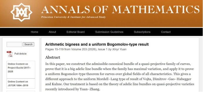 Peking University, January 19, 2026: Peking University professor Yuan Xinyi has recently published a 105-page single-author paper in Annals of Mathematics, an international top-tier math journal, in which he proves a uniform Bogomolov-type theorem, opening a new door in arithmetic geometry.