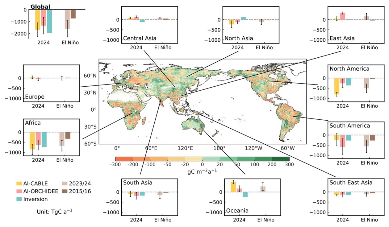 Fig. Abnormal carbon sinks in global and regional terrestrial ecosystems in 2024 and the two most recent strong El Nino events.