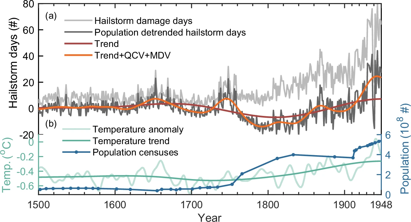 By analyzing 2,890 years of historical hail damage records and data from over 2,000 weather stations across China, researchers identified the number of hailstorm days was constant before 1850, but increased significantly afterwards. Similarly, the global mean temperature changed only slightly before 1850, but increased by approximately 0.8 degrees between 1850 and 1948. By using a decomposition method to look at the correlation, the researchers found a high possibility that the rise in hailstorm days was driven by the increase in global temperature.