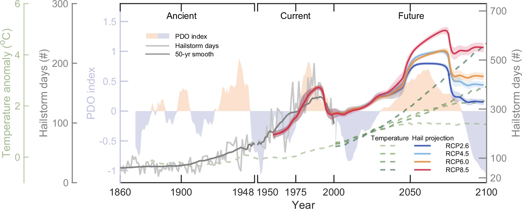 Fig.2: Historical and projected trends of hailstorm days in relation to temperature anomalies and the PDO.